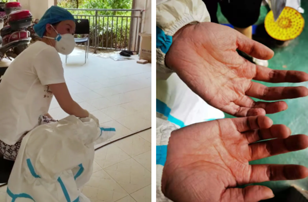 在长沙某小区 ,一名采样人员出现中暑症状;BB贝博艾弗森采样人员双手被汗水泡得发白、发皱
